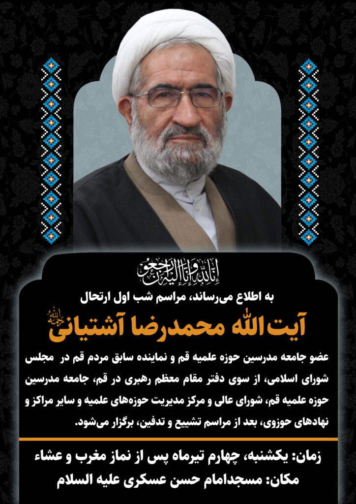 به اطلاع میرساند، مراسم شب اول ارتحال آیت الله محمدرضا آشتیانی -رحمت الله علیه-، عضو جامعه مدرسین حوزه علمیه قم و نماینده مردم قم در دورههای هفتم تا نهم مجلس شورای اسلامی، از سوی دفتر مقام معظم رهبری در قم، جامعه مدرسین حوزه علمیه قم، شورای عالی و مرکز مدیریت حوزههای علمیه و سایر مراکز و نهادهای حوزوی، بعد از مراسم تشییع و تدفین، برگزار میشود.