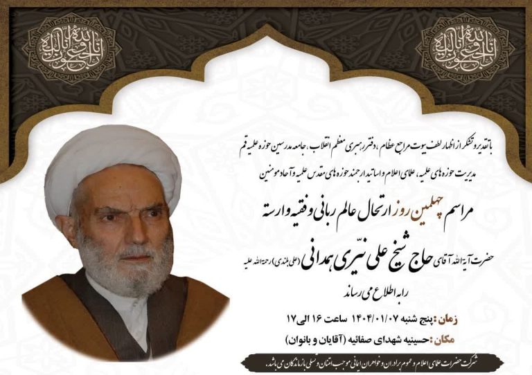 به اطلاع میرساند؛ مراسم چهلمین روز درگذشت عالم ربانی و فقیه وارسته حضرت آیت الله آقای حاج شیخ علی نیّری همدانی، عضو فقید جامعه مدرسین حوزه علمیه قم برگزار میشود.