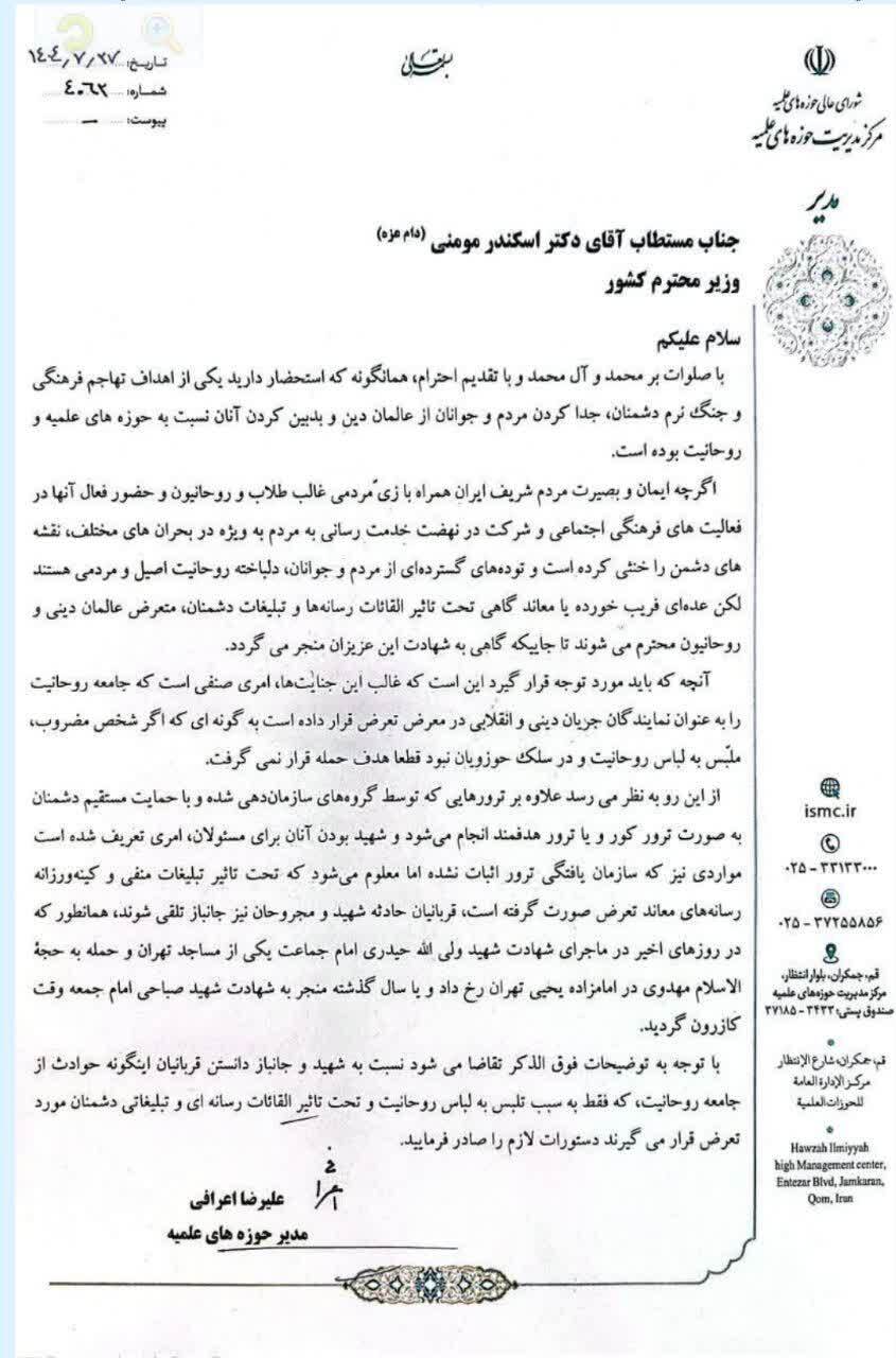 به گزارش روابط عمومی جامعه مدرسین حوزه علمیه قم، آیتالله اعرافی مدیر حوزههای علمیه طی نامهای خطاب به وزیر کشور نسبت به شهید و جانباز دانستن قربانیان حوادث از جامعه روحانیت، که فقط به سبب تلبس به لباس روحانیت و تحت تاثیر القائات رسانهای و تبلیغاتی دشمنان مورد تعرض قرار میگیرند، تأکید کرد.